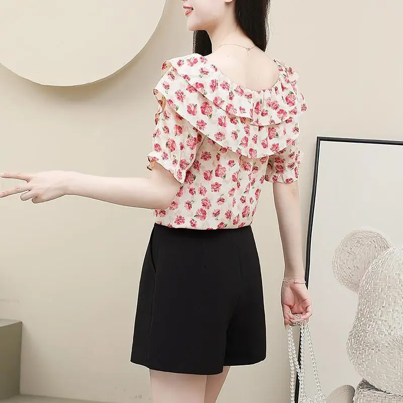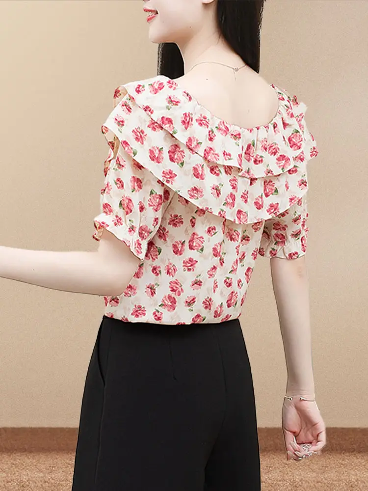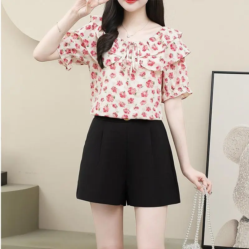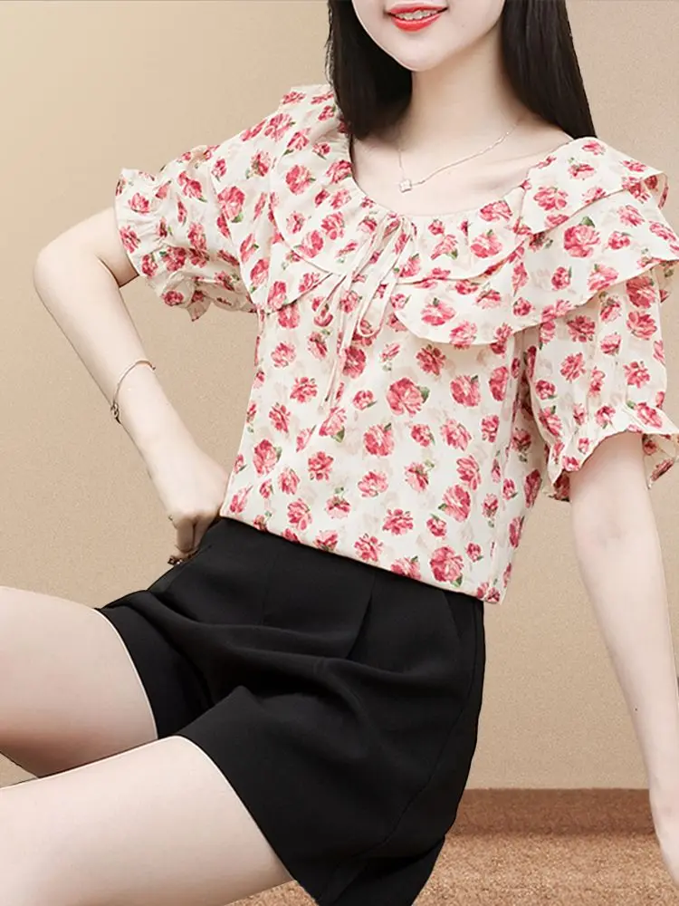 Summer Women’s Clothing Crew Neck Pullover Drawstring Plant&Flowers Printing Chiffon Short Sleeved T-shirt Casual Loose Tops